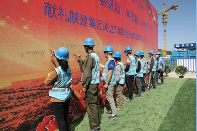 啟動儀式上,公司生產(chǎn)管理部副部長路潔宣讀了《勞動競賽實施方案》,明確此次勞動競賽旨在加快施工進度,提高生產(chǎn)效率,提高工程質(zhì)量、確保安全生產(chǎn),保證8月10日交付使用。施工單位、勞務公司代表分別作表態(tài)發(fā)言。他們表示將會以實際行動推進項目建設,不辱使命、全力以赴,奮力完成各項任務目標,為陜建集團成立70周年獻禮。隨后,全體人員在勞動競賽背景墻簽字承諾。