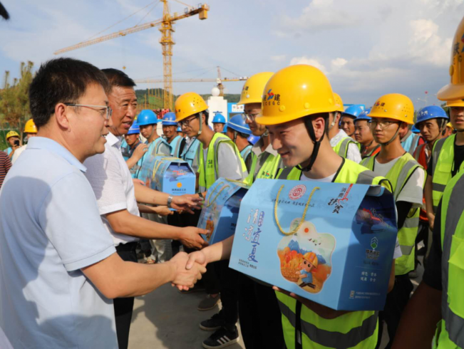 8月10日,延安市政協(xié)副主席、市總工會黨組書記、主席黑樹林一行來到陜建十三建公司南泥灣紅色文化小鎮(zhèn)項(xiàng)目慰問項(xiàng)目一線建設(shè)者,為他們送去茶葉、蜂蜜、綠豆、小米等防暑降溫物品。市總工會副主席、女職委主任鄭艷霞,南泥灣開發(fā)區(qū)黨工委副書記折克銀,市總工會辦公室副主任、困難職工幫扶中心主任惠瑞國,市總工會辦公室副主任、宣教部負(fù)責(zé)人康靖華,陜建十三建公司紀(jì)委書記、工會主席張軍祥出席活動。