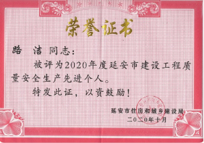 路潔、郭塬浩榮獲“延安市建設(shè)工程質(zhì)量安全生產(chǎn)先進個人”榮譽稱號。