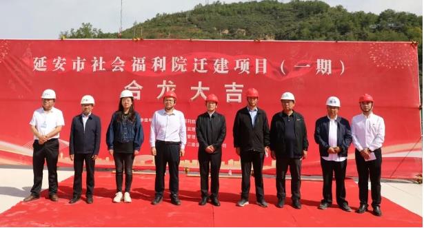 延安市民政系統(tǒng)職工代表,社會福利院職工代表,各設計、施工、監(jiān)理單位代表及全體項目管理人員等參加封頂儀式。