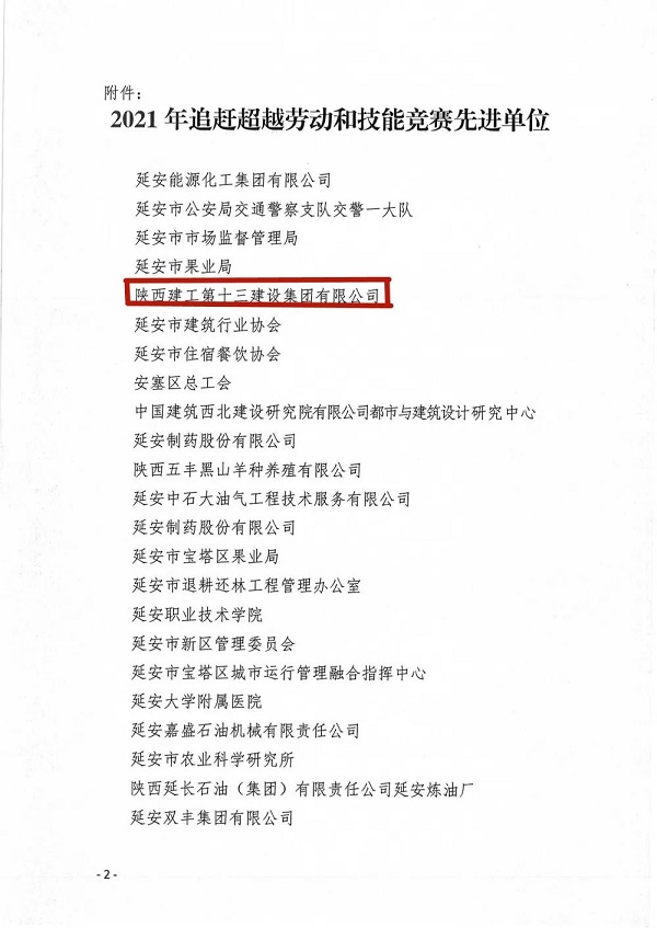 近日,延安市總工會(huì)公布了2021年追趕超越勞動(dòng)和技能競(jìng)賽先進(jìn)單位名單。陜建十三建集團(tuán)榮獲延安市2021年追趕超越勞動(dòng)和技能競(jìng)賽先進(jìn)單位。