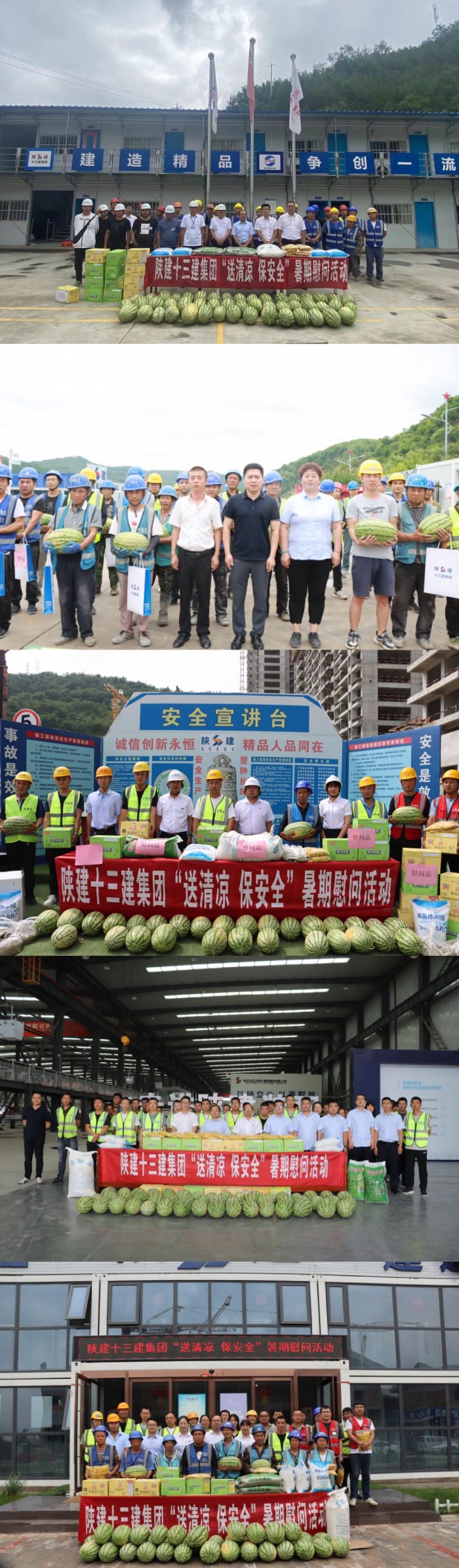 集團(tuán)總工程師王弘起,副總經(jīng)理楊永宏,副總經(jīng)理張鑫偉,總會計師劉小衛(wèi),紀(jì)委書記、工會主席李靜分別前往延安市社會福利院遷建項目(一期)、延安南泥灣工匠學(xué)院項目、伴山樾谷·芳菲里項目、延安新型建材公司、信天游文創(chuàng)餐飲街區(qū)等項目開展慰問活動,代表集團(tuán)公司對高溫天氣堅守在一線的廣大員工及工友表示親切的問候和衷心的感謝,并為大家送上西瓜、白糖、綠豆、菊花、冰糖、飲料、花露水等防暑降溫物品。同時,叮囑項目部要始終把安全放在首位,科學(xué)安排施工作業(yè)時間,做好后勤保障工作,制定防暑防汛工作預(yù)案,在確保一線施工作業(yè)人員健康安全的前提下抓質(zhì)量提進(jìn)度,緊盯項目節(jié)點目標(biāo),圓滿完成各項建設(shè)任務(wù)。