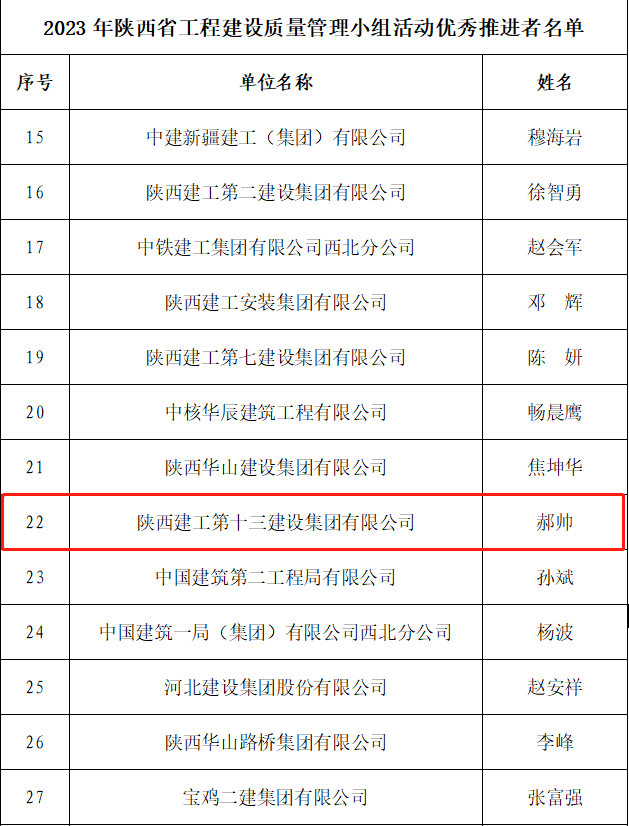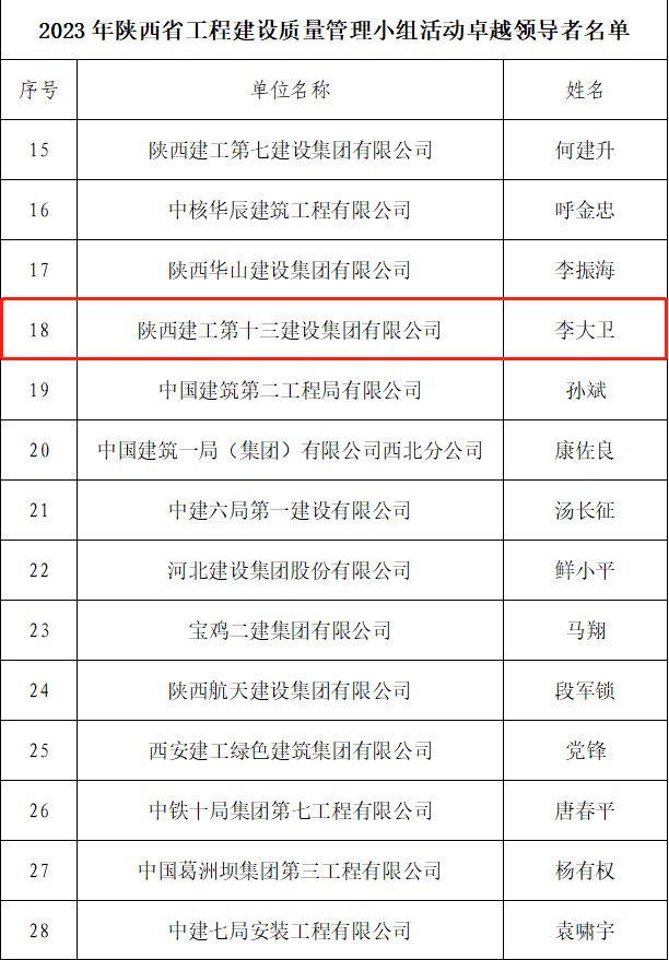 此外,陜西建工第十三建設(shè)集團(tuán)有限公司被評為“2023年陜西省工程建設(shè)質(zhì)量管理小組活動先進(jìn)企業(yè)”;集團(tuán)副總工程師、科技質(zhì)量部部長李大衛(wèi)被評為“2023年陜西省工程建設(shè)質(zhì)量管理小組活動卓越領(lǐng)導(dǎo)者”;郝帥被評為“2023年陜西省工程建設(shè)質(zhì)量管理小組活動優(yōu)秀推進(jìn)者”。
