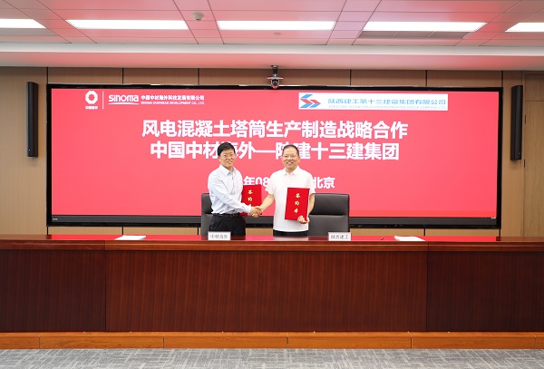 8月1日,集團與中國中材海外科技發(fā)展有限公司在北京就風電混凝土塔筒生產(chǎn)制造簽訂戰(zhàn)略合作協(xié)議并簽訂陜西榆林定邊項目混凝土塔筒預(yù)制管片采購合同。中國中材海外科技發(fā)展有限公司黨委書記、執(zhí)行董事高超,集團黨委書記、董事長卜國平代表雙方簽約并致辭。