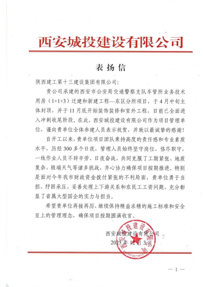 西安城投建設(shè)有限公司向集團(tuán)致表?yè)P(yáng)信,對(duì)集團(tuán)承建的西安市公安局交通警察支隊(duì)車(chē)管所業(yè)務(wù)技術(shù)用房(1+1+3)拆遷和新建工程─東區(qū)分所項(xiàng)目致以表?yè)P(yáng)。信中指出,項(xiàng)目歷經(jīng)300多個(gè)日夜,建設(shè)人員不辭辛勞、日夜奮戰(zhàn),克服工期緊張、地質(zhì)復(fù)雜、極端天氣等諸多挑戰(zhàn),齊心協(xié)力推進(jìn)項(xiàng)目順利實(shí)施。特別在面對(duì)資金緊張,集團(tuán)勇于擔(dān)當(dāng)、紓困承壓,積極協(xié)調(diào)各方關(guān)系,穩(wěn)妥處理農(nóng)民工工資問(wèn)題,充分彰顯了國(guó)有企業(yè)的實(shí)力與擔(dān)當(dāng)。希望集團(tuán)能繼續(xù)保持精益求精的施工標(biāo)準(zhǔn)和安全生產(chǎn)保障,確保項(xiàng)目按期圓滿(mǎn)收官。