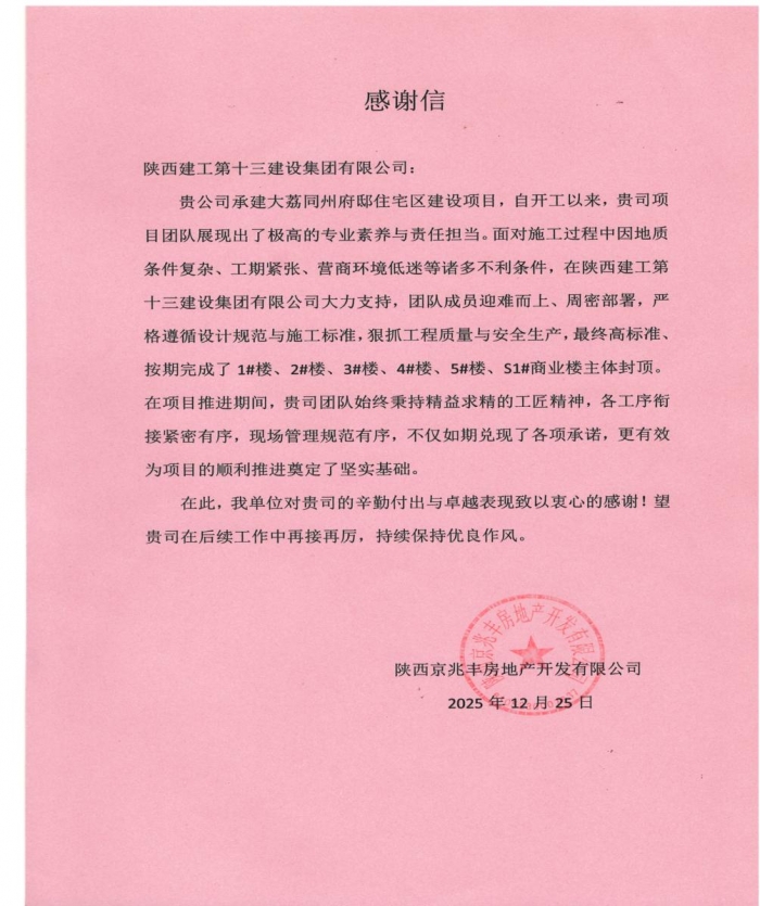 陜西京兆豐房地產(chǎn)開(kāi)發(fā)有限公司向集團(tuán)致感謝信,對(duì)集團(tuán)承建的大荔同州府邸住宅區(qū)建設(shè)項(xiàng)目展現(xiàn)出的極高專(zhuān)業(yè)素養(yǎng)與責(zé)任擔(dān)當(dāng)致以感謝。信中指出,集團(tuán)項(xiàng)目團(tuán)隊(duì)克服地質(zhì)條件復(fù)雜、工期緊張、營(yíng)商環(huán)境低迷等不利因素,通過(guò)迎難而上、緊密銜接、規(guī)范管理,順利實(shí)現(xiàn)多棟住宅樓及商業(yè)樓主體封頂。希望集團(tuán)再接再厲,繼續(xù)保持優(yōu)良作風(fēng),確保按期完成建設(shè)任務(wù)交付使用。