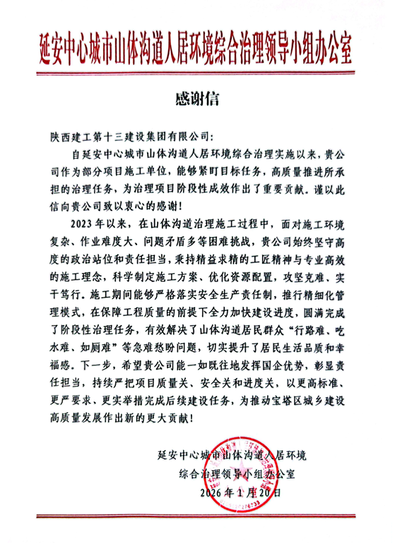 1月20日,延安市中心城市山體溝道人居環(huán)境綜合治理領(lǐng)導(dǎo)小組辦公室為集團施工的山體溝道人居環(huán)境綜合治理工程成效發(fā)來感謝信。